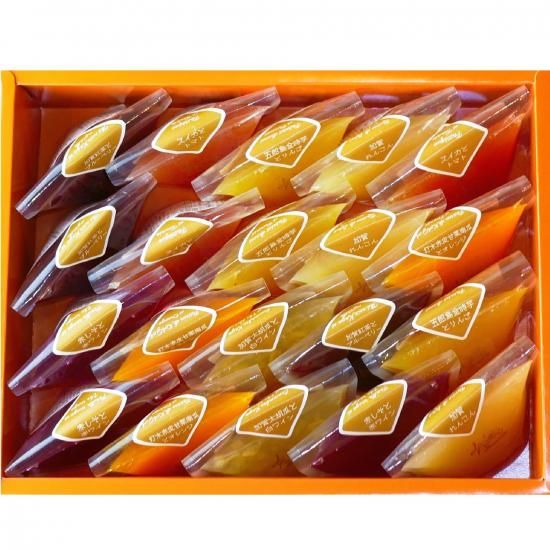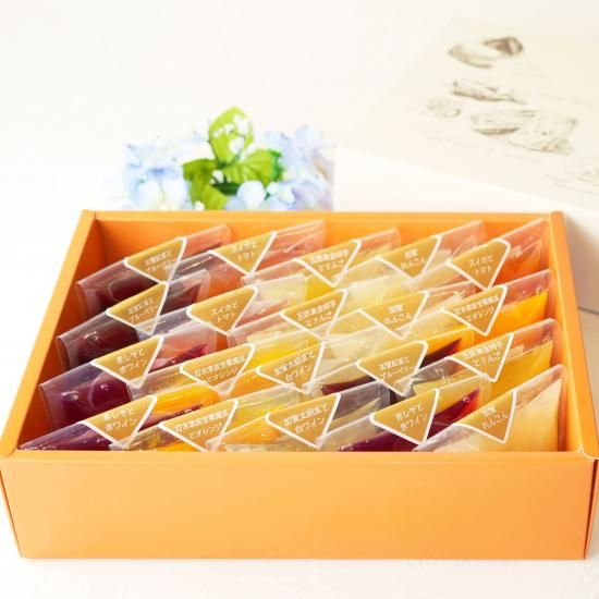 ジュレ・ドゥ・金澤20個入は、地元石川の素材を使用した贅沢な味わいの詰め合わせです。打木赤皮甘栗南瓜とオレンジ、五郎島金時芋とりんご、加賀蓮根と洋梨、スイカとトマト、赤しそと能登赤ワイン、加賀太胡瓜と能登白ワイン、加賀紅茶とブルーベリーの7種のジュレの詰合わせギフト。