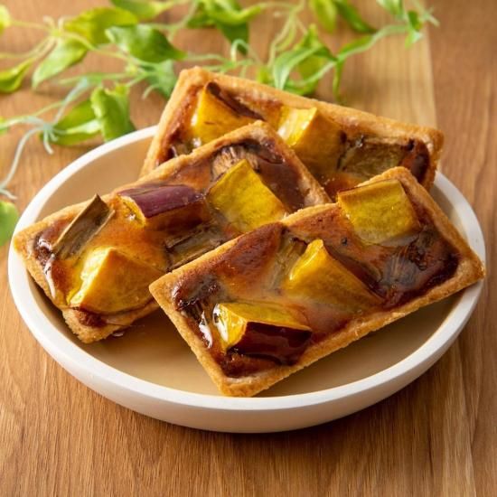 パリ・エ・金澤タルト(五郎島金時とルバーブ)/バター(オランダ産・国産)、植物油脂、アーモンドパウダー(米産)、砂糖、卵(国産)、小麦粉、ラム酒、ウイスキー酒、ルバーブ(石川県産)、五郎島金時(石川県産)(着色料:クチナシ)、スパイス(バニラ、シナモン、グローブ、カルダモン、ローリエ) 。ナパージュ(砂糖、ブドウ糖果糖液糖、ペクチン、クエン酸、アルギン酸Na、ソルビン酸K、水 ※アレルギー物質:小麦、りんご、柑橘)。